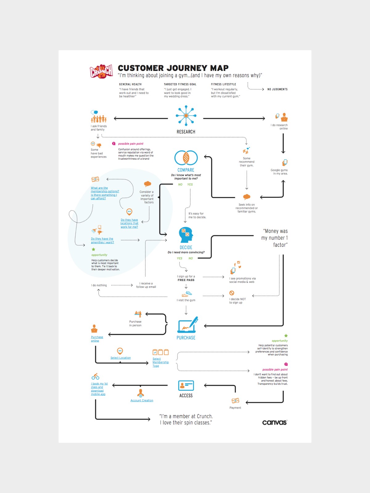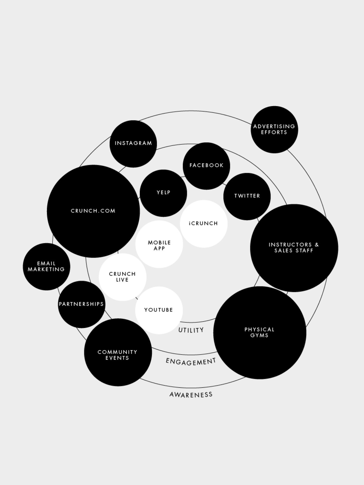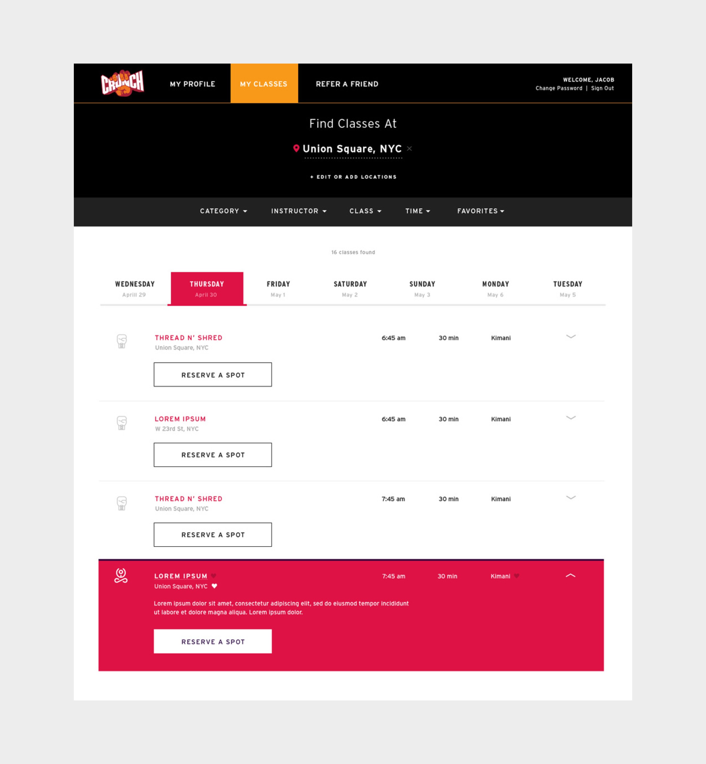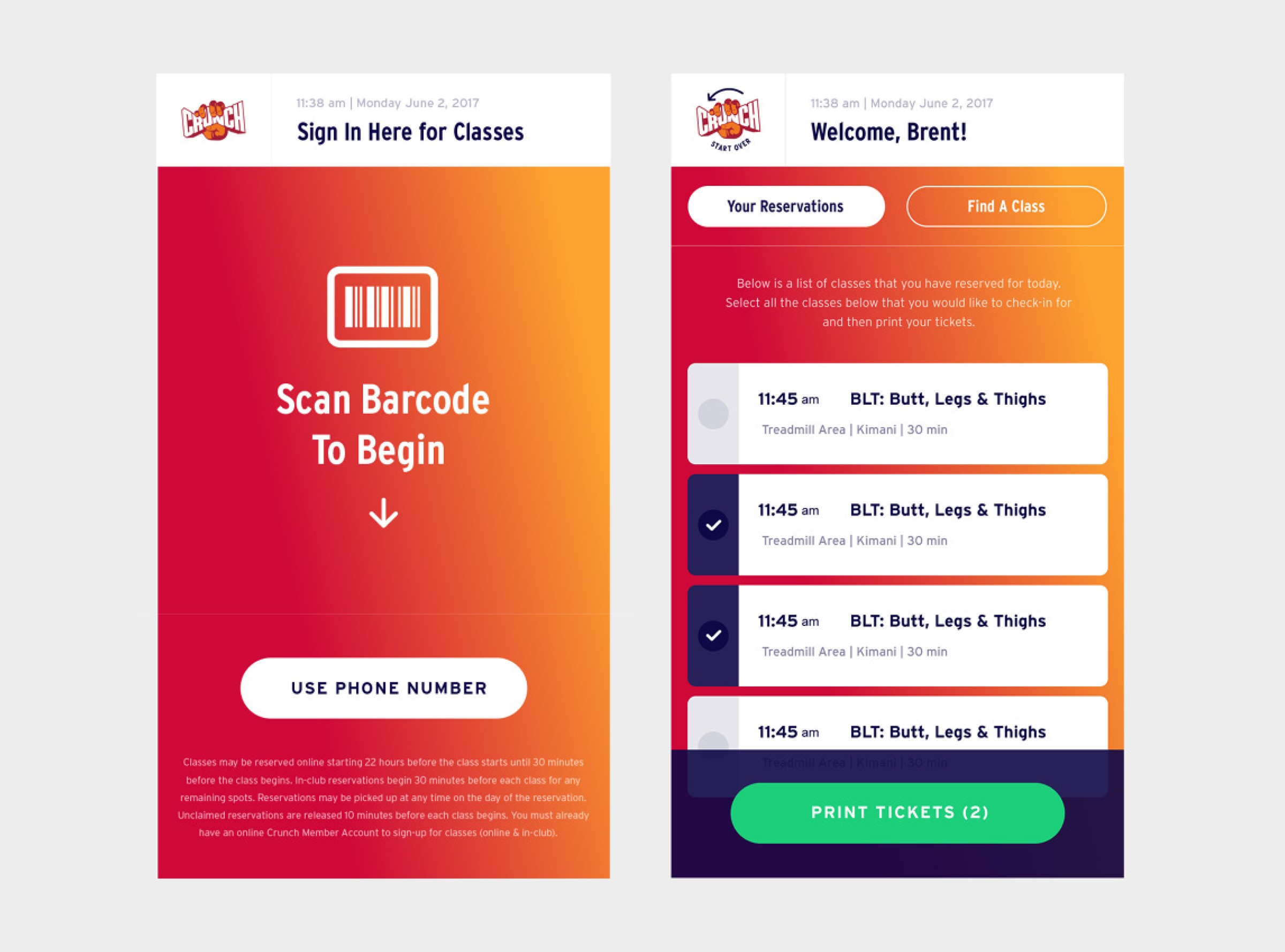 Working as a Creative Director and Product Designer at Canvas United, Crunch Fitness came to us with the need to freshen up what had become a stale brand and a clunky web experience. This entailed a complete digital overhaul... including updates to their identity system, a responsive website capable of club exploration and membership purchase, a separate membership login experience, as well as an in gym kiosk for reserving classes. This required a deep dive into understanding the fitness landscape in general, Crunch’s brand history, and the user journey from checkout to gym floor.