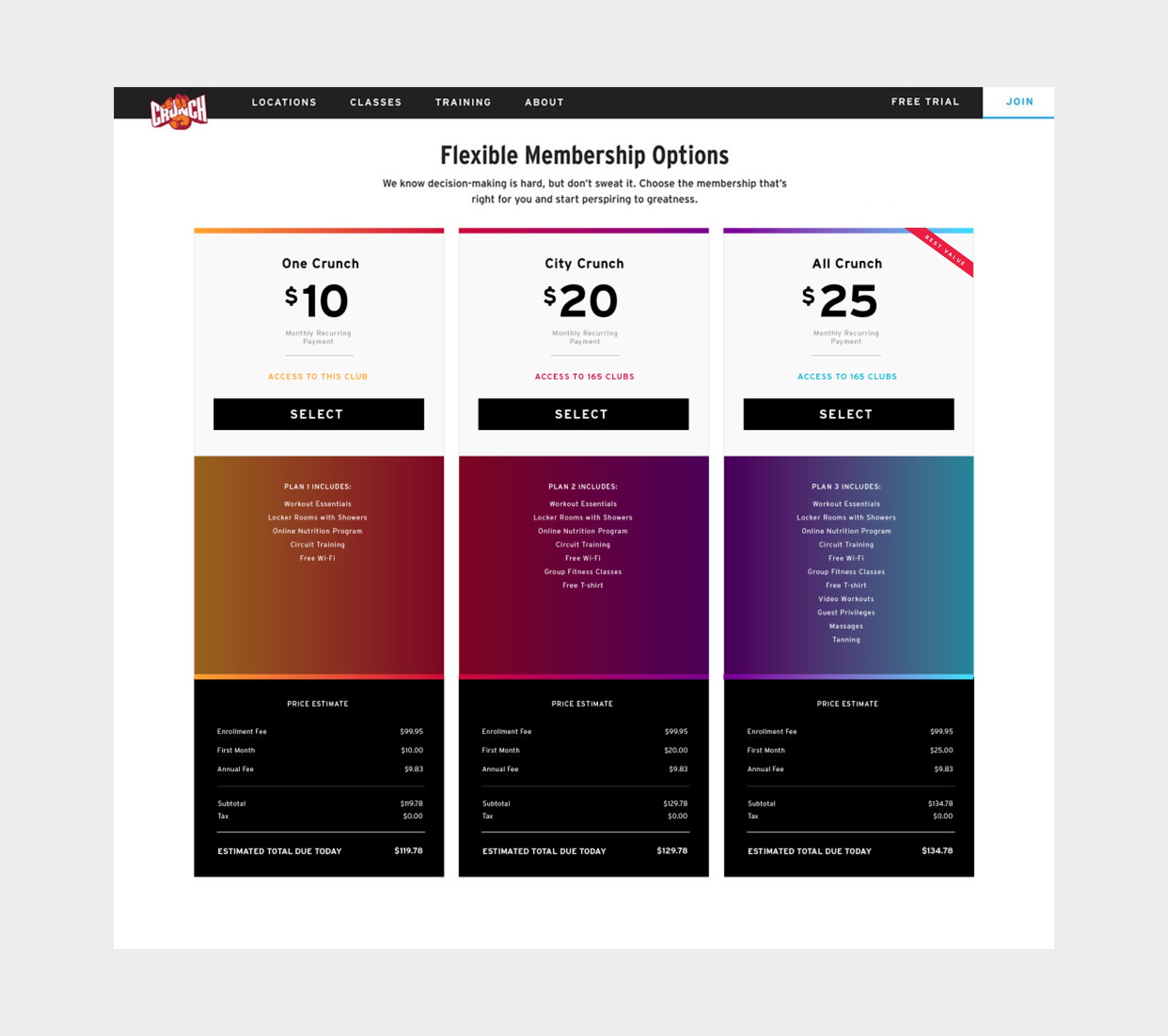 Utilizing geolocation was helpful and necessary to service more relevant content and regional deals throughout the site, along with making it easier for users to find the closest gyms while searching. Crunch had two main different gym types, Corporate and Franchise gyms, making it more confusing and difficult for users to compare gyms. Showcasing features and the different experiences across these two gym types was crucial. The comparison also helped justify the price difference between the two. This led to two different templates depending on whether price or experience was the bigger selling point. I also streamlined the checkout process, making it a much better experience for users. This entailed simplifying prices, standardizing amenities and language, and better highlighting the value, all of which aided in driving conversions for Crunch and less confusion from users.