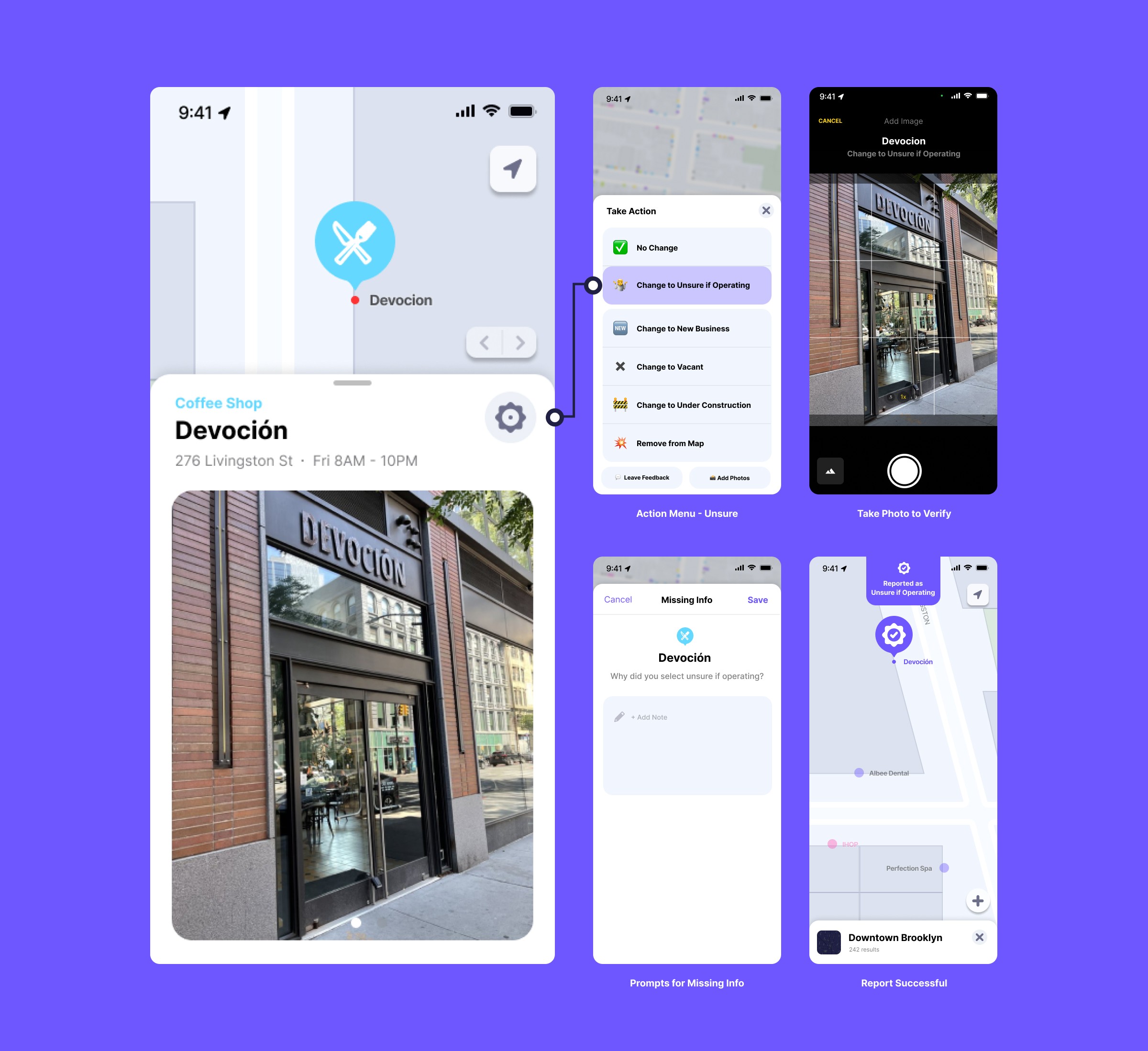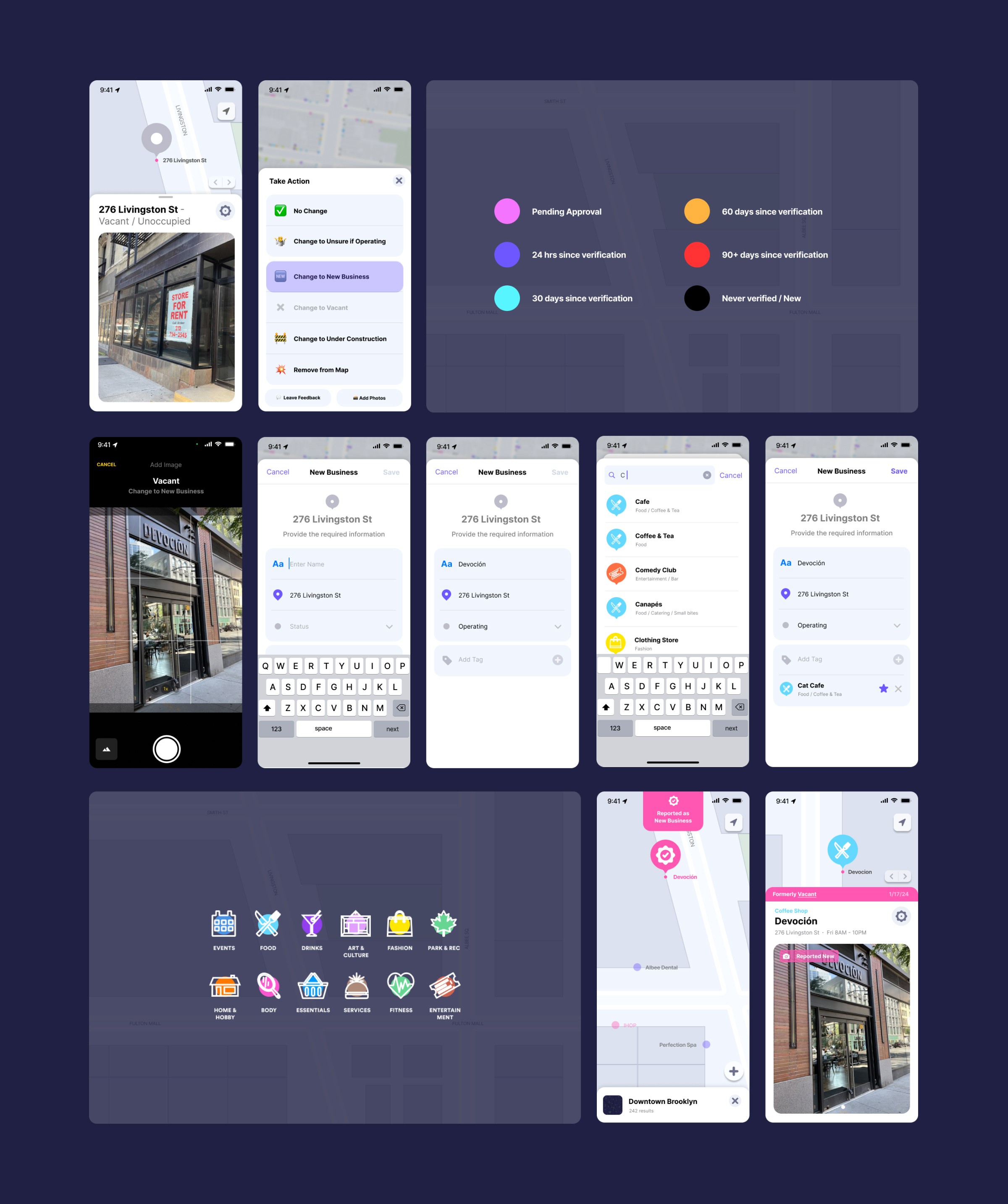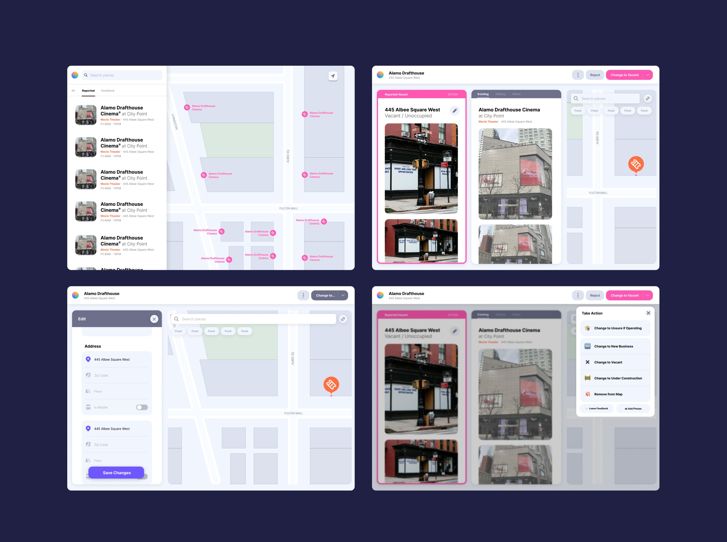Mapping was only one side of the project. Once the data was collected, it had to be reviewed and approved in case there were any errors. I created prototypes to test with the founders and select mappers to see how they interacted with the new platform. There were several flows for all of the main actions: No Change, Unsure if Operating, New Business, Vacant, Under Construction, Remove. Each action rendered a “Reported” label on the space to indicate something had been submitted and was awaiting approval. I also created a new admin dashboard process for the approval of incoming data.