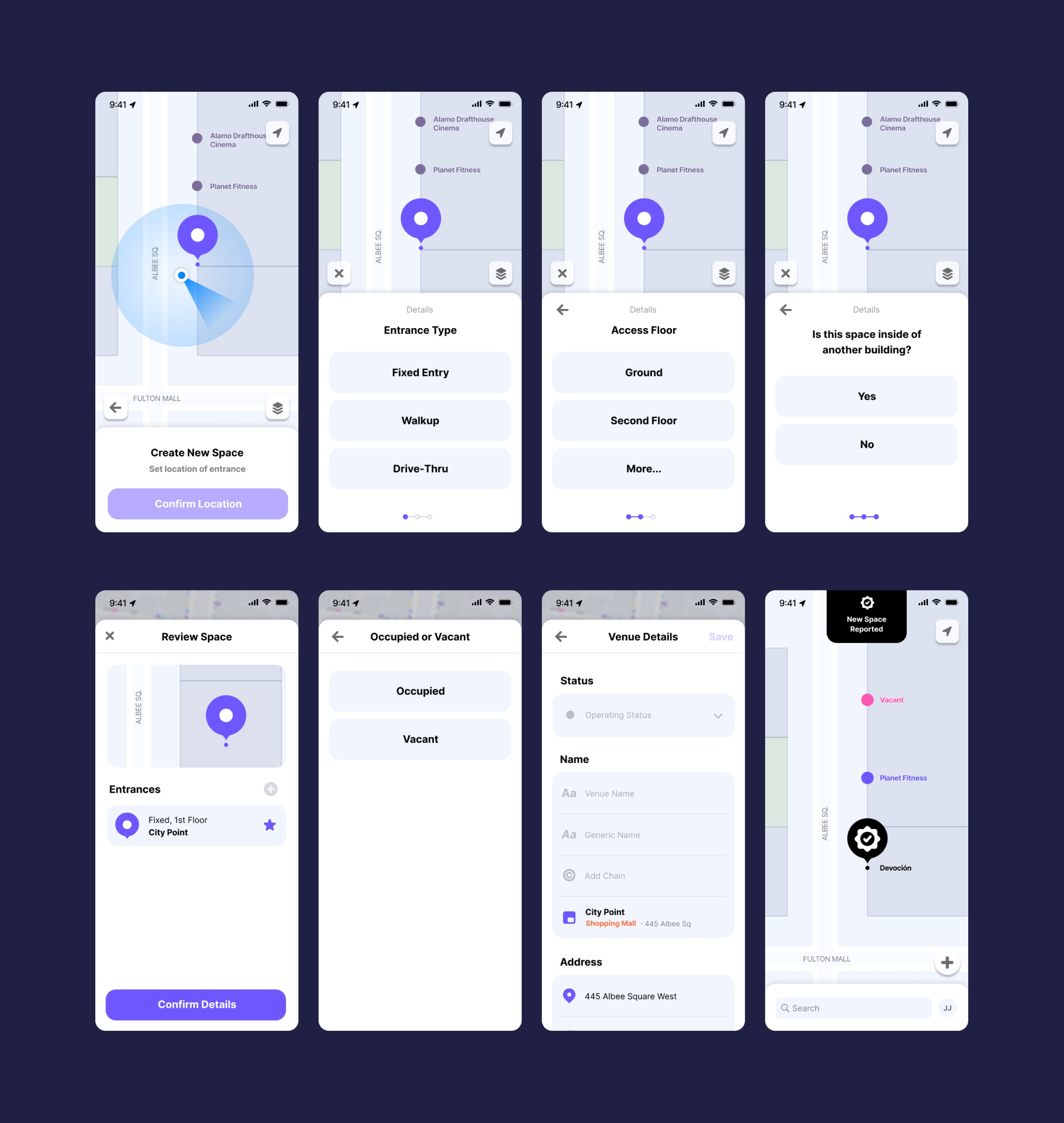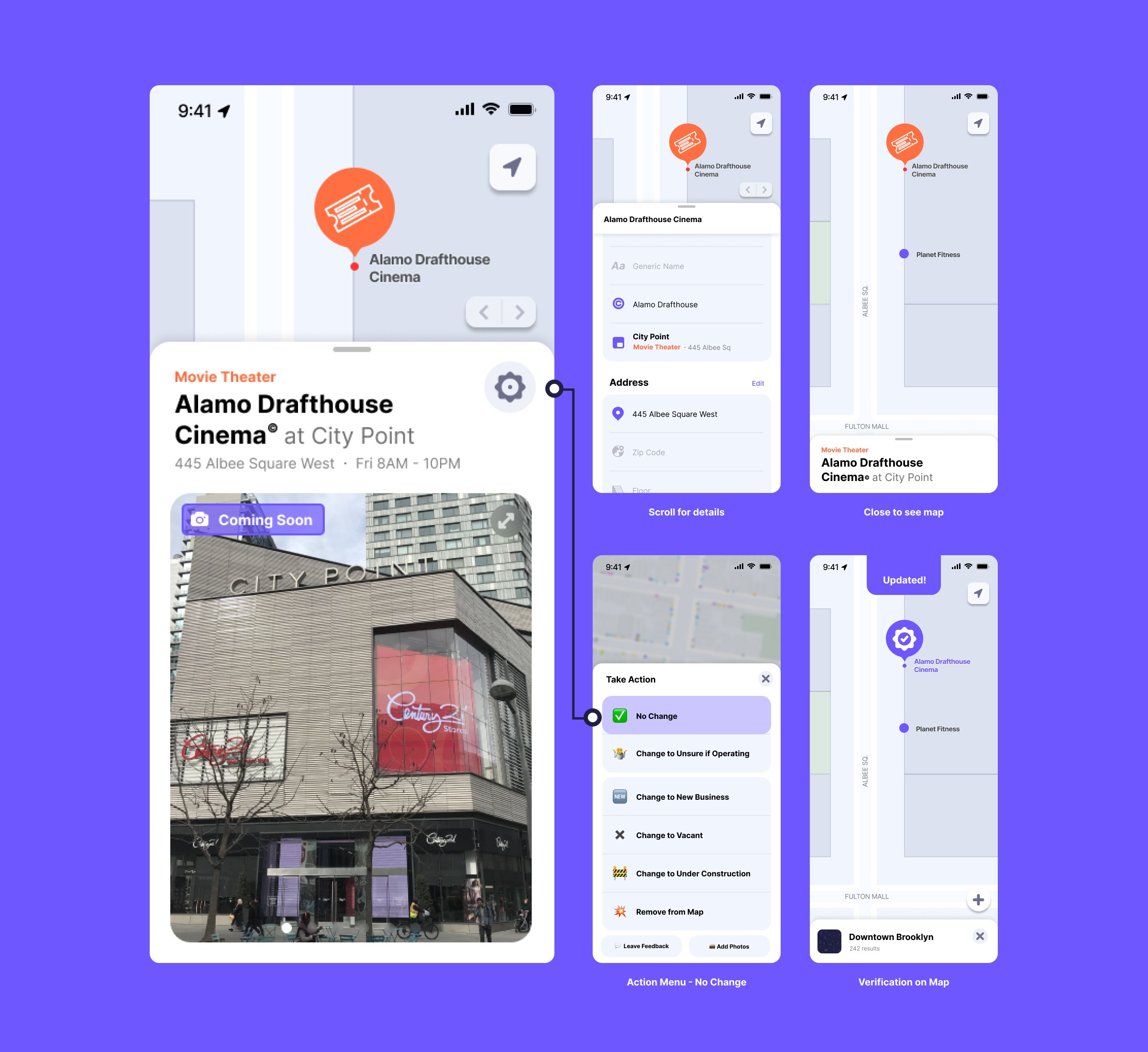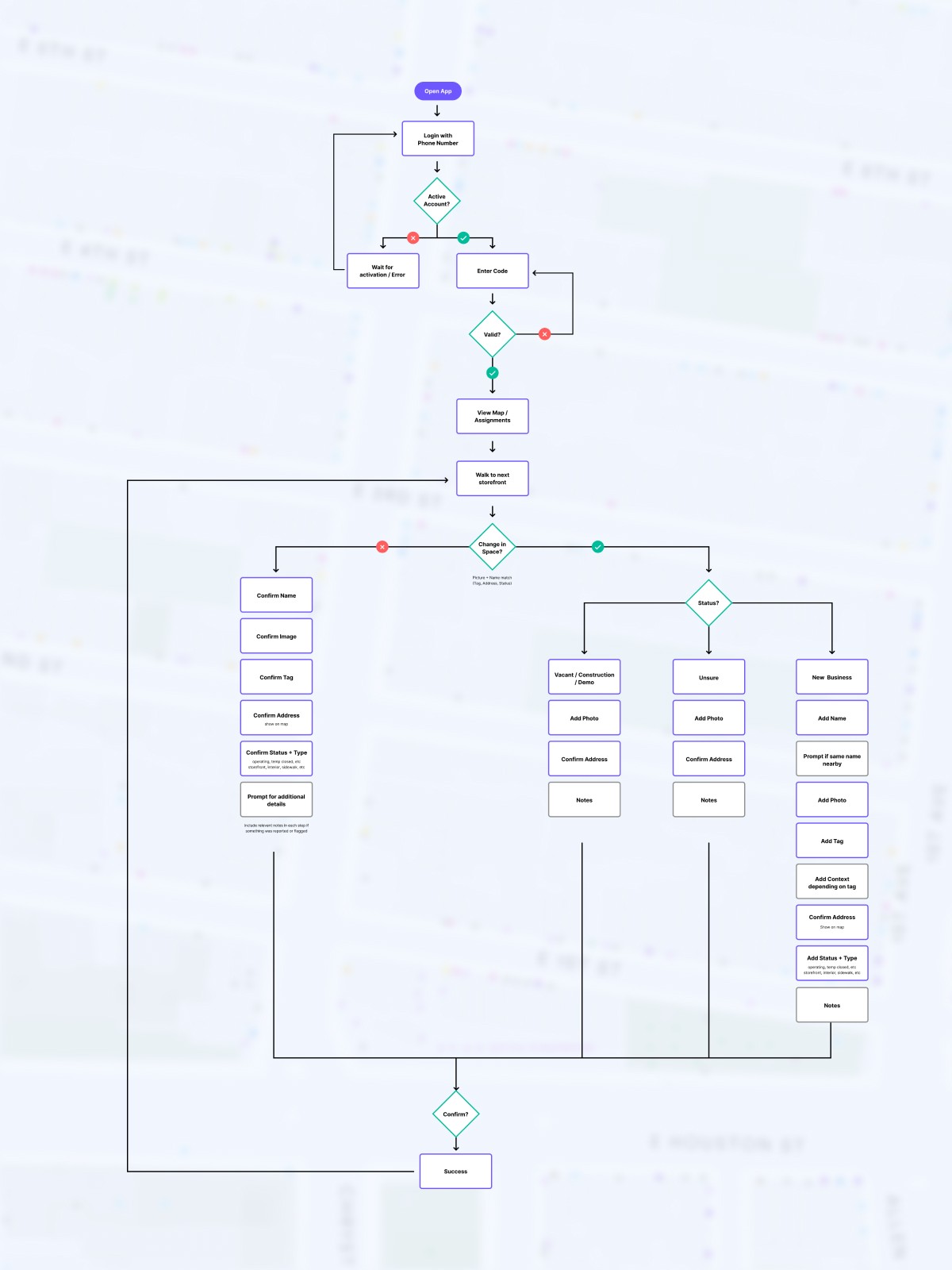 Mapping was only one side of the project. Once the data was collected, it had to be reviewed and approved in case there were any errors. I created prototypes to test with the founders and select mappers to see how they interacted with the new platform. There were several flows for all of the main actions: No Change, Unsure if Operating, New Business, Vacant, Under Construction, Remove. Each action rendered a “Reported” label on the space to indicate something had been submitted and was awaiting approval. I also created a new admin dashboard process for the approval of incoming data.
