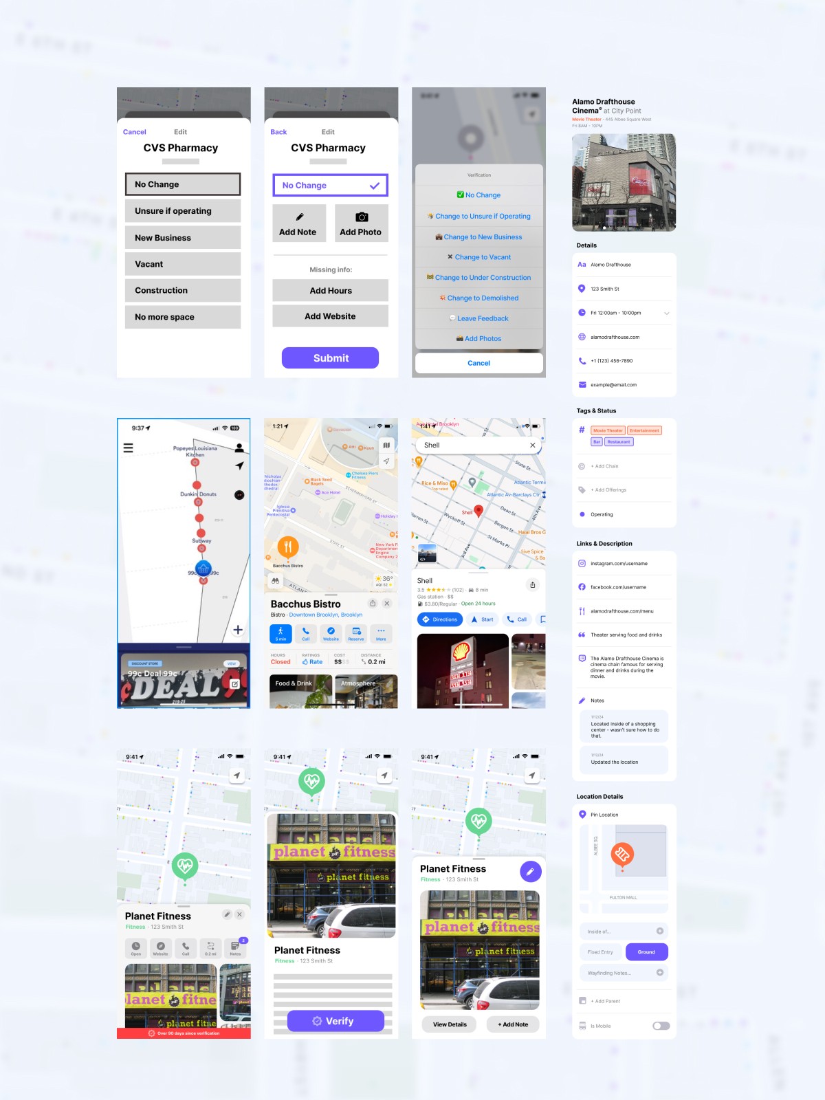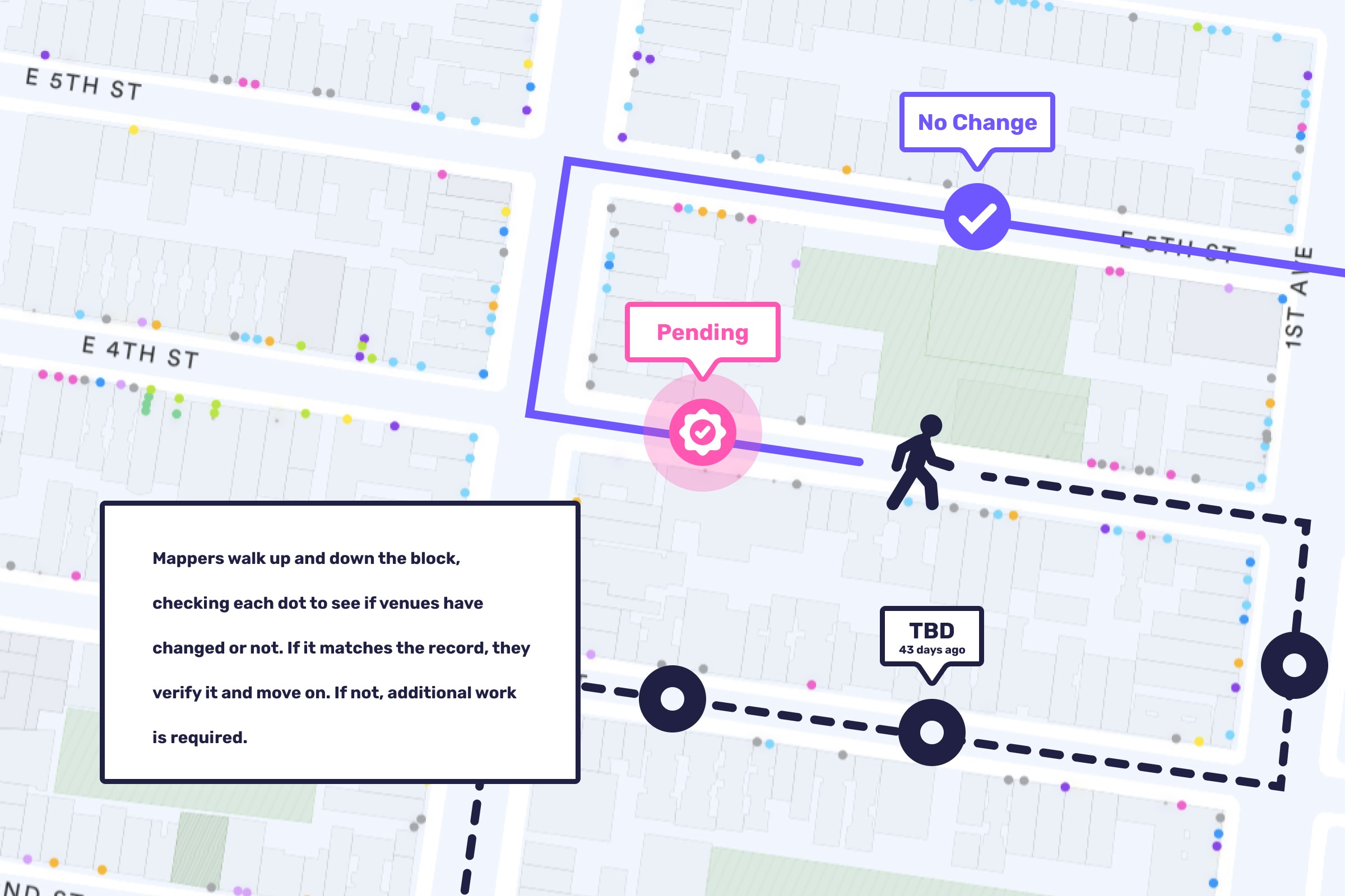 A block would get mapped once every 30 days or so. As most places remained the same month to month, the most common action for a mapper was identifying a location as unchanged and simply moving on to the next space. Being the most frequent and important interaction, I built the rest of the experience radiating out from there. Another key issue was that mappers would often input data on the wrong space or create new spaces for somewhere that already existed. To avoid this, I made the name and photo must more prominent on the location cards. I also noticed that several spaces had incomplete information that was often ignored by mappers in the field. To correct this, I added smart prompts that would appear during the flow in order to capture the necessary information, thus filling in all gaps and avoiding the additional step in the future.