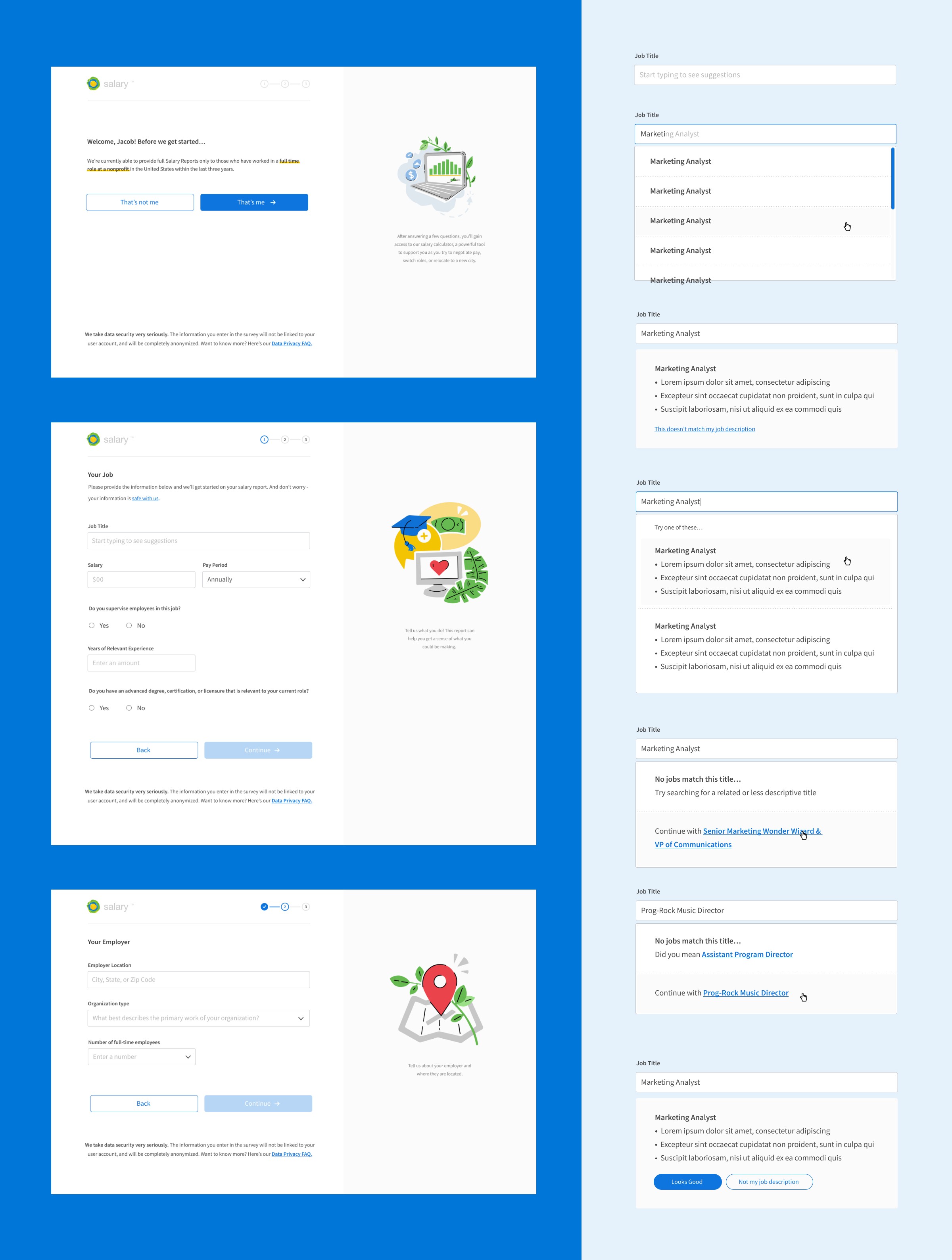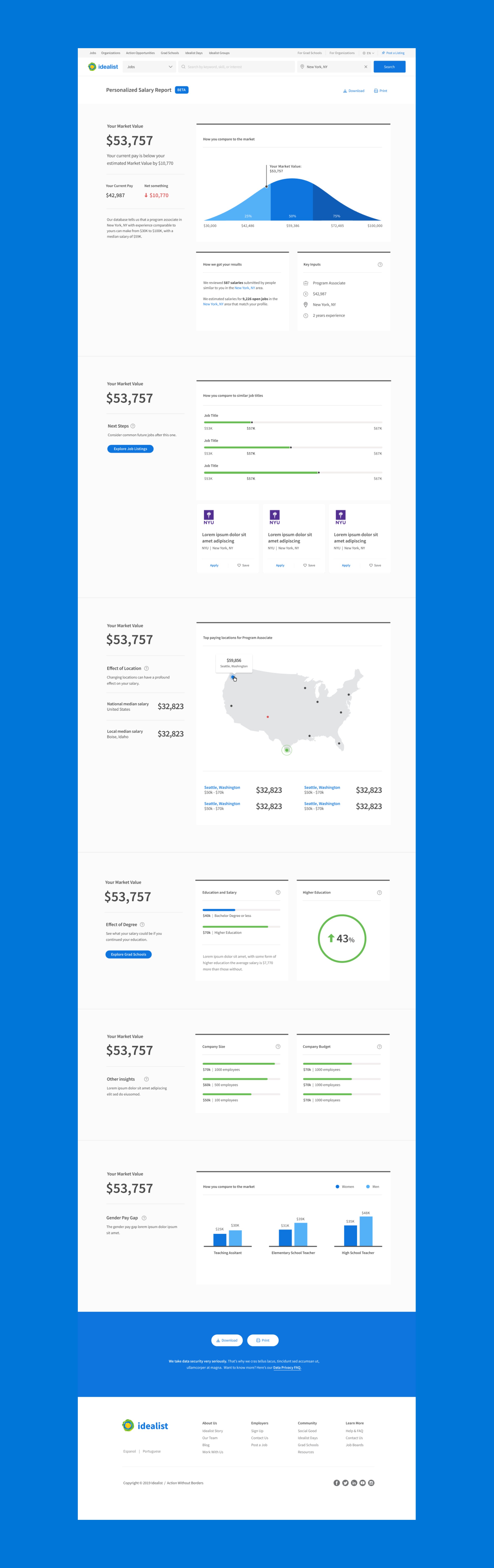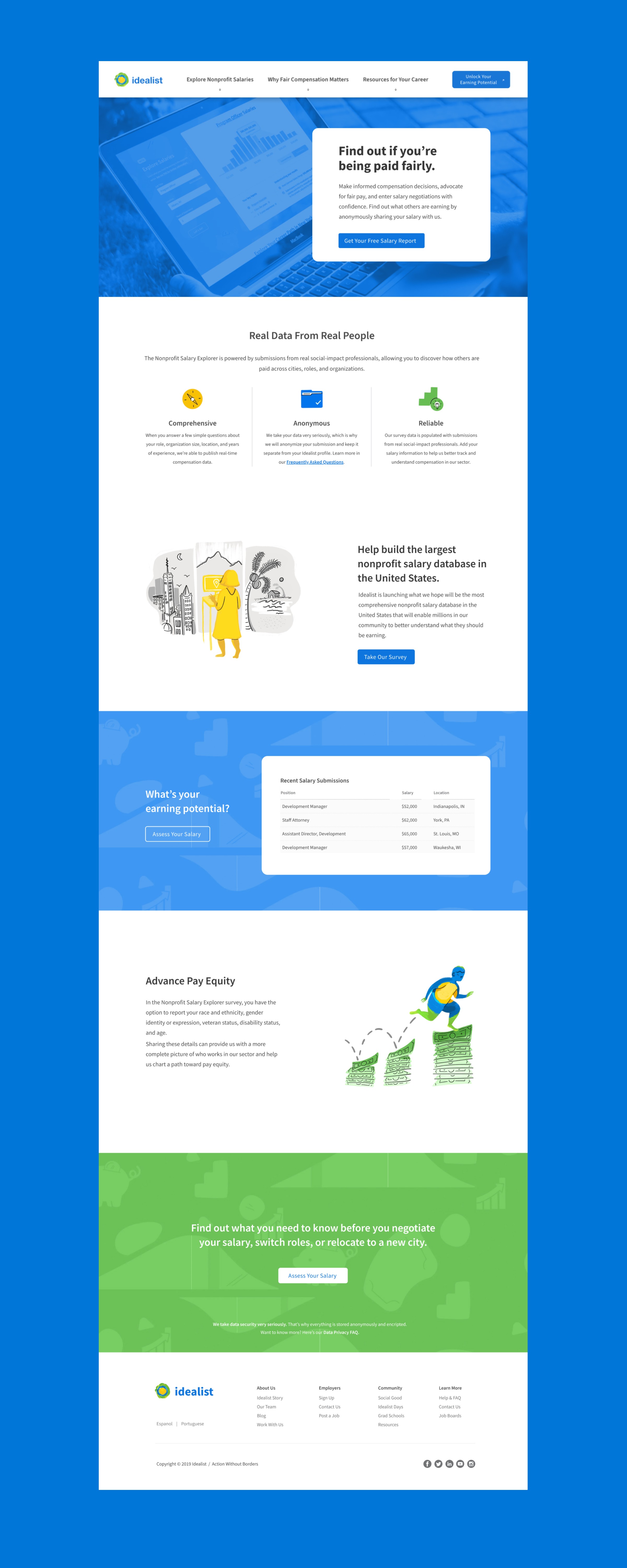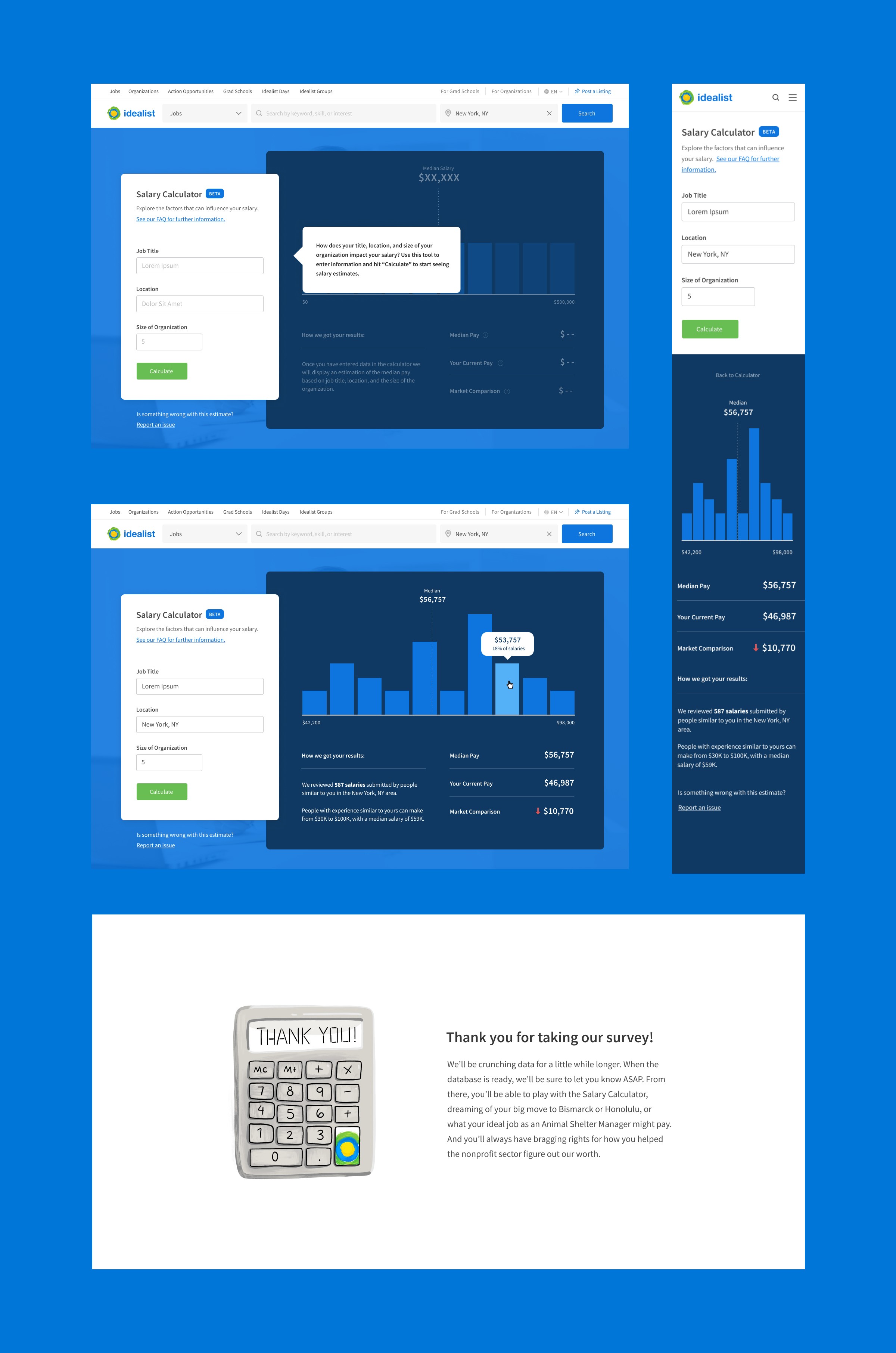 Idealist, a nonprofit job board and pillar of the nonprofit community, wanted to create a tool that advocated for salary transparency, fair pay, and informed decision making when it came to nonprofit careers. Not only would this product help employees, but it would also inform employers about larger industry standards. As lead designer, I was tasked with creating the data-gathering survey, salary report, and interactive calculator that would provide users with salary information, along with the strategy on how to collect it and what could be done once it was obtained.